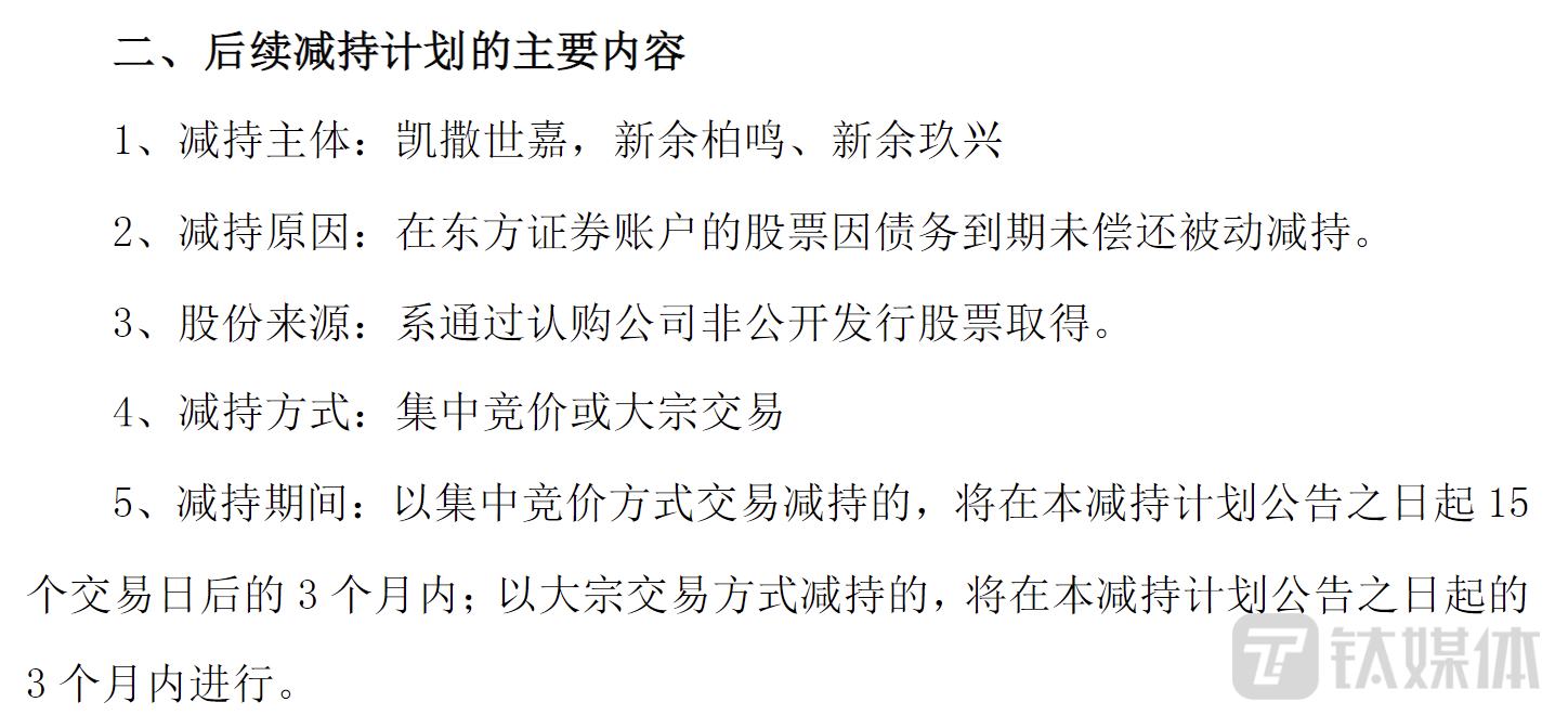 *ST凯撒曾于3月18日发布《关于控股股东及一致行动人被动减持及后续减持计划的预披露公告》,公告提及控股股东凯撒世嘉及其一致行动人,将以大宗交易方式或集中竞价方式进行减持,被动减持合计不超过1%股份。