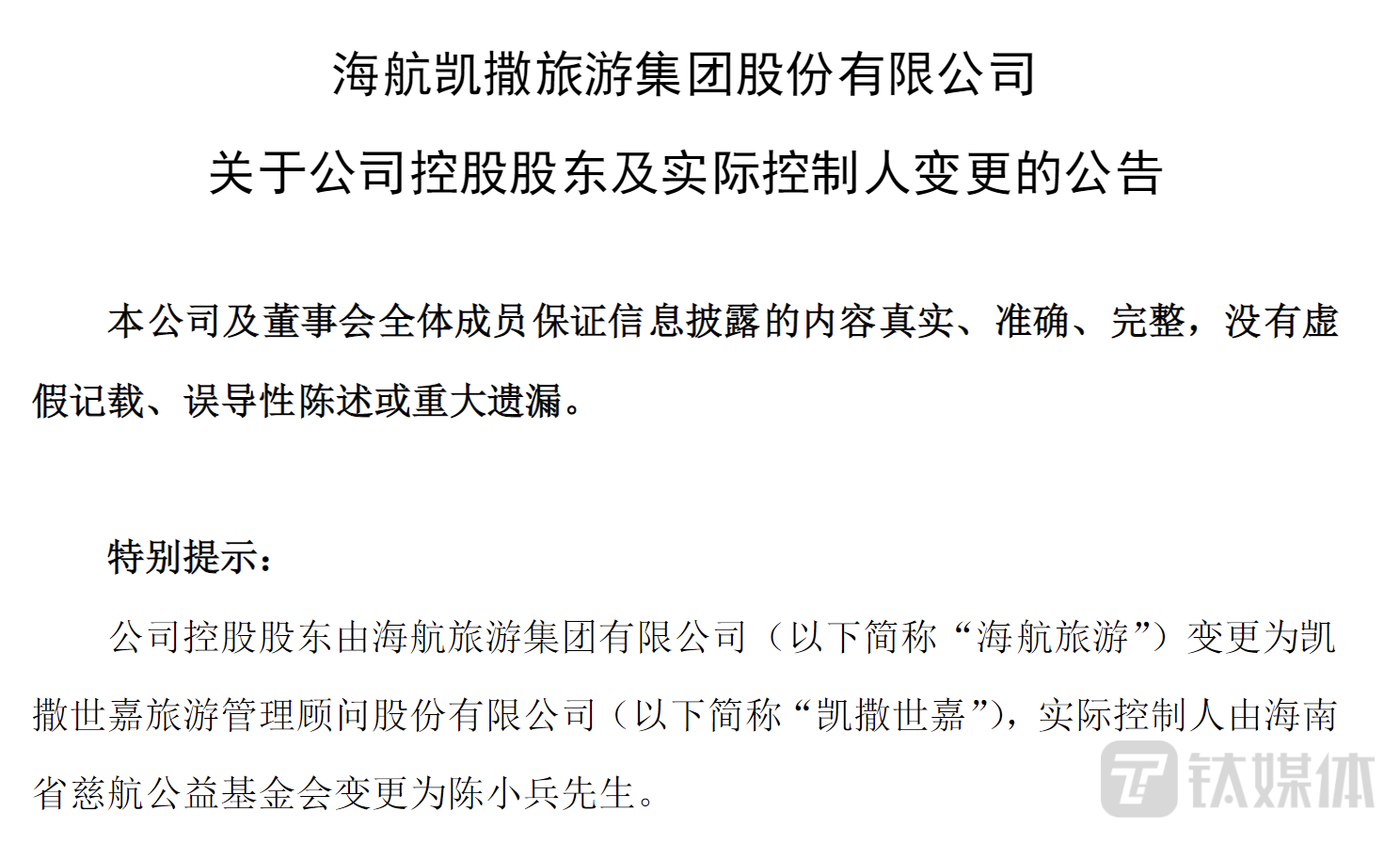 截至目前,*ST凯撒尚未收到凯撒世嘉及海航旅游有关实际控制人变更或对公司董事推选调整的通知,公司控股股东仍为凯撒世嘉,实际控制人仍为陈小兵。