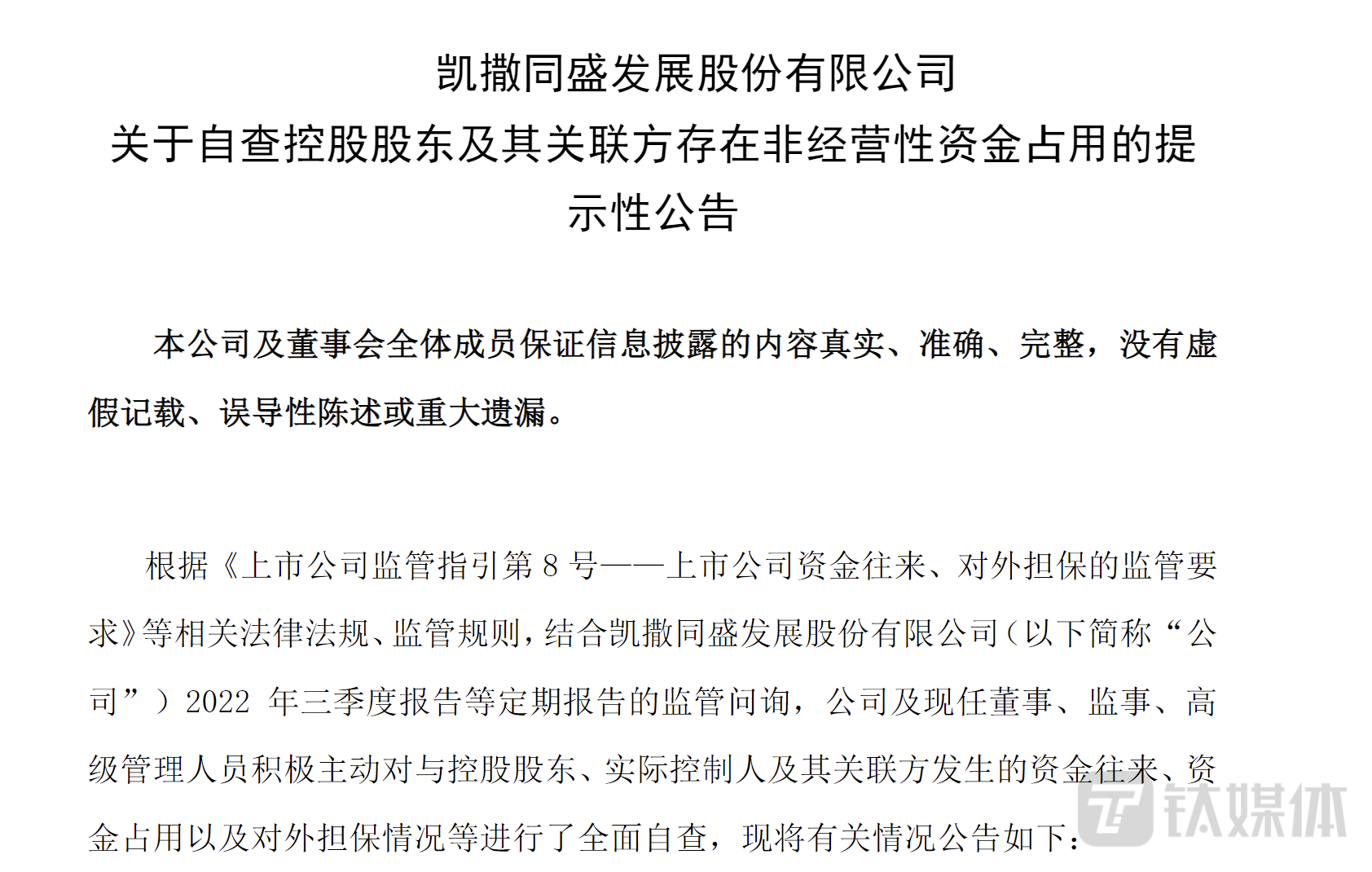 亏损扩大的同时,*ST凯撒再添事端。公司通过全面自查发现,截至2022年12月31日,控股股东凯撒世嘉及其关联单位与公司存在78104.42万元非经营性资金往来来构成非经营性资金占用。