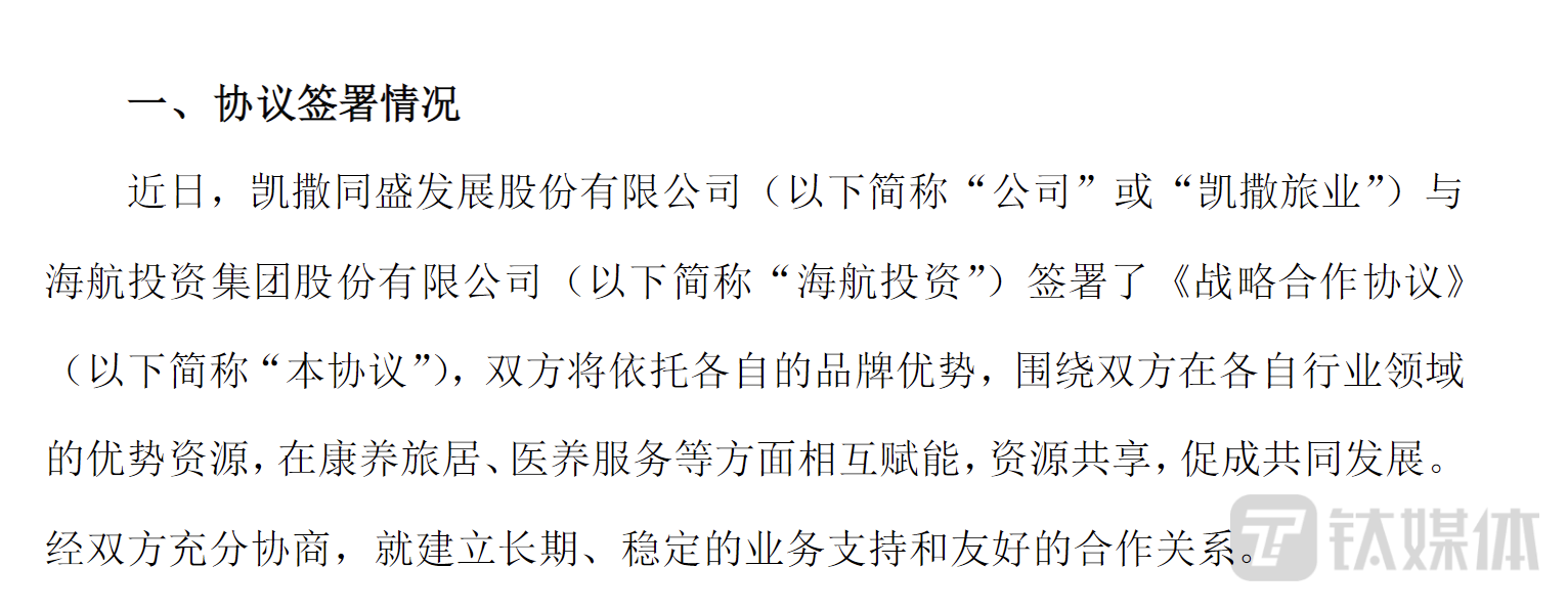5月23日,*ST凯撒披露公告,宣布与海航投资(即*ST海投)签署《战略合作协议》,双方将围绕各自行业领域的优势资源,在康养旅居和医养服务等方面相互赋能等方面相互合作,资源共享,促成共同发展。