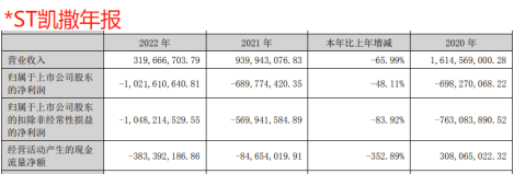 营收快速下降,净利润连续巨亏。2020年2021年和2022年,*ST凯撒分别实现营业收入16.15亿元、9.40亿元和3.20亿元,实现净利润-6.98亿元、-6.90亿元和-10.22亿元,三年合计亏损24.10亿元。