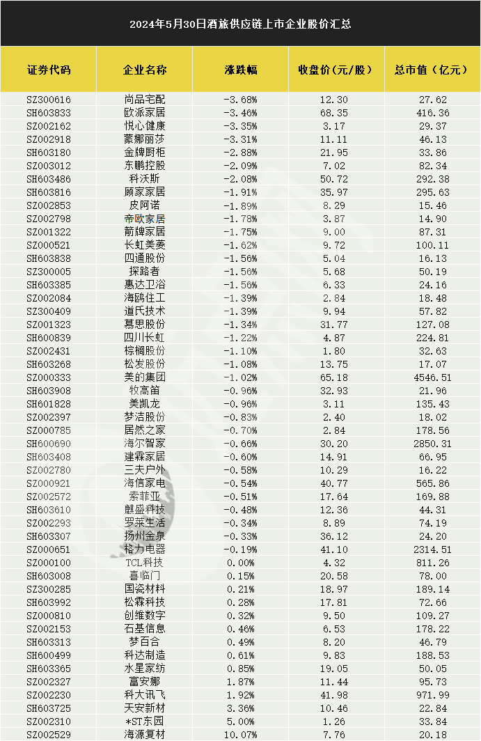 酒旅供应链个股方面,尚品宅配(SZ:300616)、欧派家居(SH:603833)、悦心健康(SZ:002162)、蒙娜丽莎(SZ:002918)跌超3%。