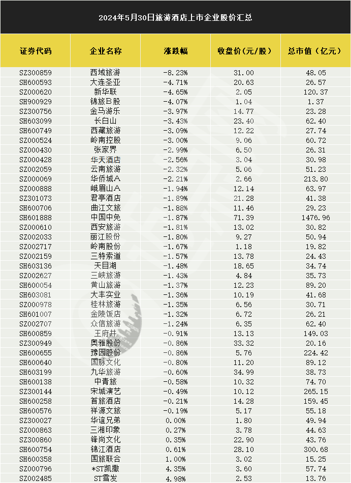旅游酒店个股方面,西域旅游(SZ:300859)跌超8%,大连圣亚(SH:600593)、新华联(SZ:000620)、锦旅B股(SH:900929)跌超4%。