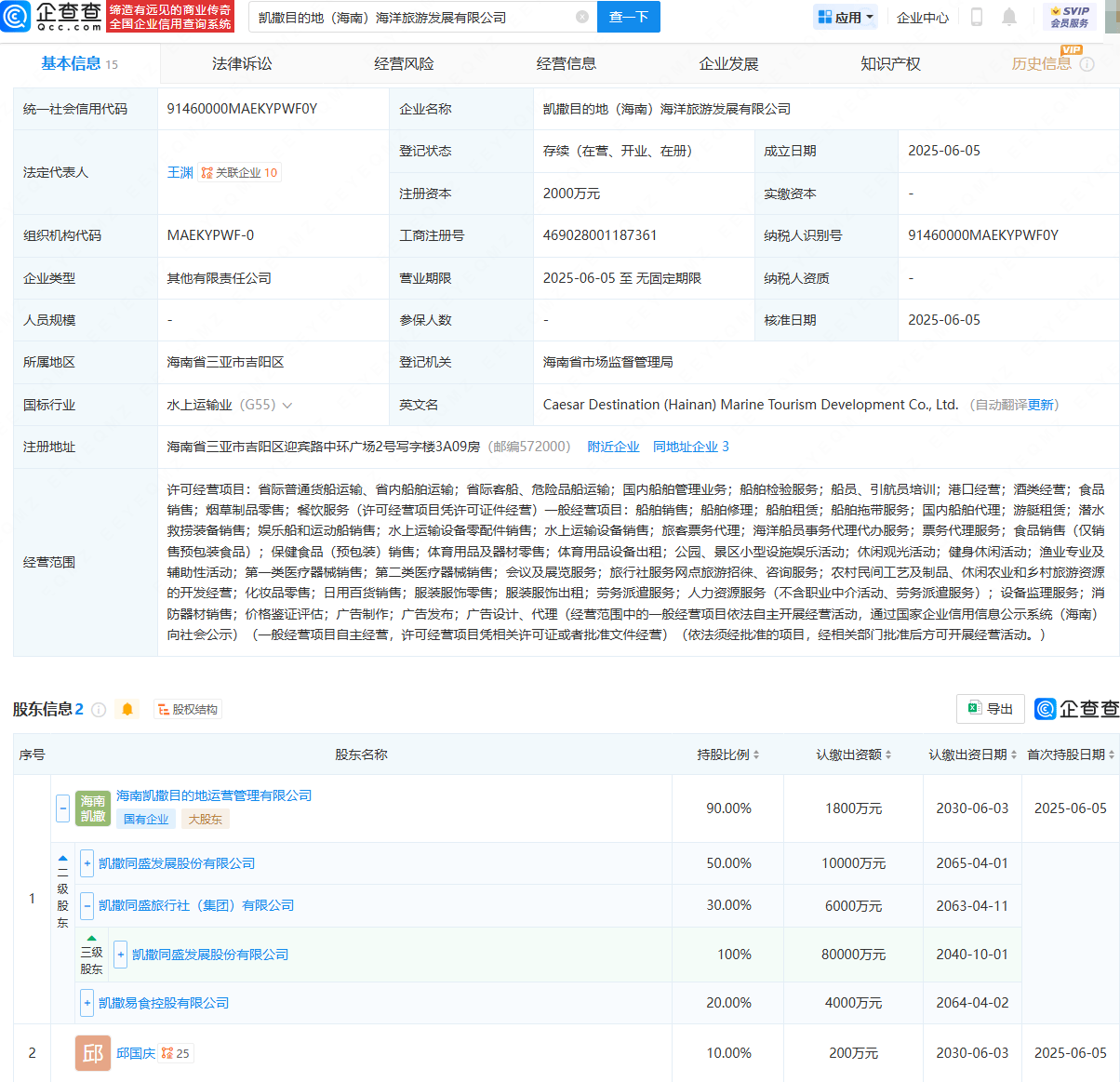 近日,凯撒目的地(海南)海洋旅游发展有限公司成立,法定代表人为王渊,注册资本为2000万元,经营范围包含:省际普通货船运输、省内船舶运输;省际客船、危险品船运输;国内船舶管理业务;船舶检验服务;船员、引航员培训;港口经营等。股权穿透显示,该公司由凯撒旅业(000796)旗下海南凯撒目的地运营管理有限公司、邱国庆共同持股。