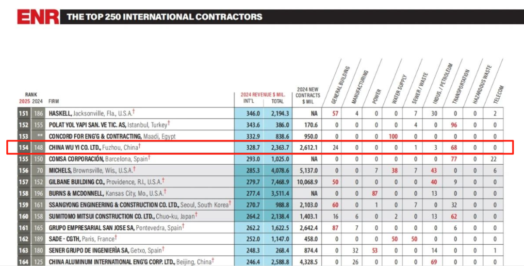 近日,2025年度美国《工程新闻纪录(ENR)》“国际承包商250强”榜单正式发布。中国武夷实业股份有限公司再度入选,位列榜单第154位,在上榜的76家中国企业中居第47位。