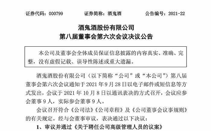 10月8日,酒鬼酒股份有限公司(以下简称“酒鬼酒”)(000799)发布《第八届董事会第六次会议决议公告》显示,第八届董事会第六次会议审议并通过《关于聘任公司高级管理人员的议案》,因工作需要,聘任王哲为公司副总经理,任期自董事会聘任之日起至本届高管层任期届满时止。