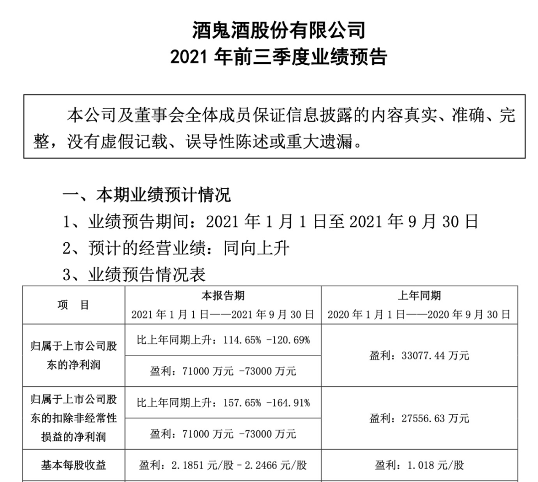三季报预告显示,酒鬼酒预计前三季度净利润为7.1亿元-7.3亿元,同比增长114.65%-120.69%。其中,公司预计第三季度扣非净利润为2.05亿元-2.2亿元,同比增长126.75%至143.35%。