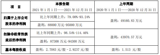 酒鬼酒昨晚公布的2021年度业绩预告显示,预计2021年实现归属于上市公司股东的净利润为8.8亿元-9.5亿元,同比增长79.00%-93.24%;扣除非经常性损益后的净利润为8.73亿元-9.43亿元,同比增长98.54%-114.46%;基本每股收益2.7083元/股–2.9237元/股,上年同期为1.513元/股。