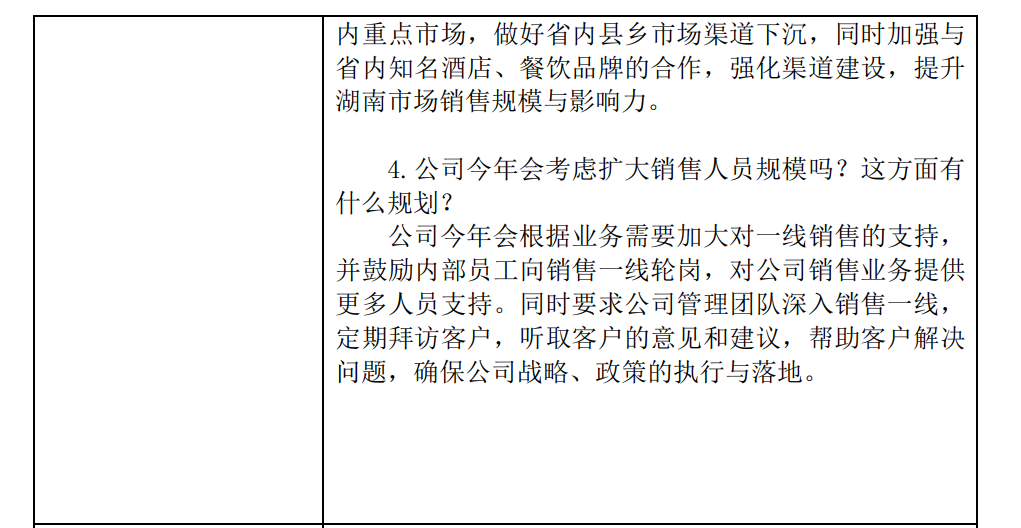 有关销售人员规划问题,酒鬼酒表示,公司今年会根据业务需要加大对一线销售的支持,并鼓励内部员工向销售一线轮岗,对公司销售业务提供更多人员支持。同时要求公司管理团队深入销售一线,定期拜访客户,听取客户的意见和建议,帮助客户解决问题,确保公司战略、政策的执行与落地。