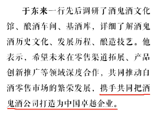 于东来表示,希望未来在零售渠道拓展、产品创新推广等领域深度合作,共同推动白酒零售市场的繁荣发展,携手共同把酒鬼酒公司打造为中国卓越企业。