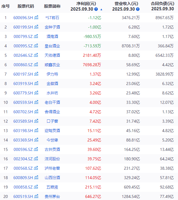 在20家白酒上市公司的业绩排名中, 酒鬼酒 的表现尤为扎眼。 同花顺 iFinD数据显示,前三季度归母净利润亏损的白酒企业共有4家, 酒鬼酒 以980.55万元的亏损额位列第三;营收低于10亿元的企业有5家, 酒鬼酒 7.60亿元的营收规模排名第四,无论是盈利状况还是营收体量,均处于行业下游水平。