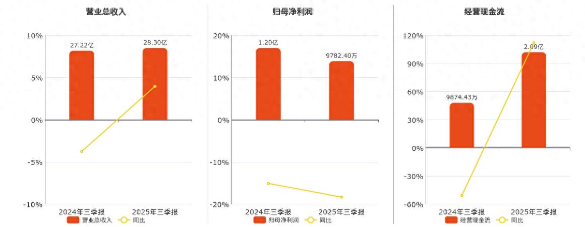 公司营业总收入为28.30亿元,在已披露的同业公司中排名第5,较去年同报告期营业总收入增加1.08亿元,同比较去年同期上涨3.96%。归母净利润为9782.40万元,在已披露的同业公司中排名第4,较去年同报告期归母净利润减少2200.84万元,同比较去年同期下降18.37%。经营活动现金净流入为2.09亿元,在已披露的同业公司中排名第5,较去年同报告期经营活动现金净流入增加1.11亿元,同比较去年同期上涨112.13%。
