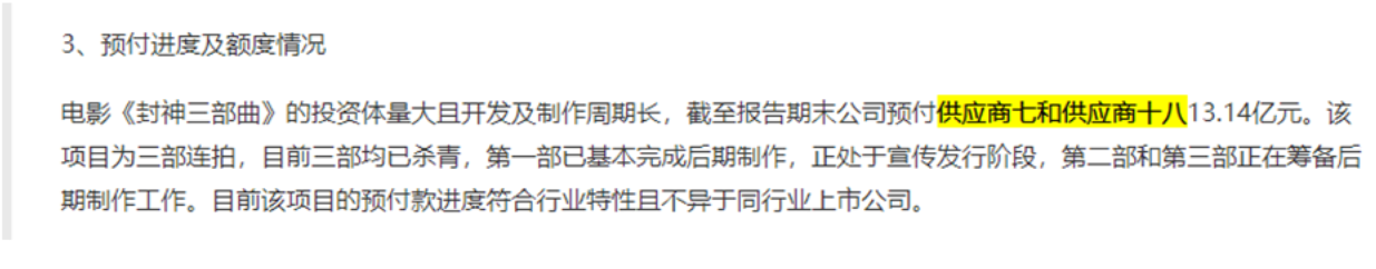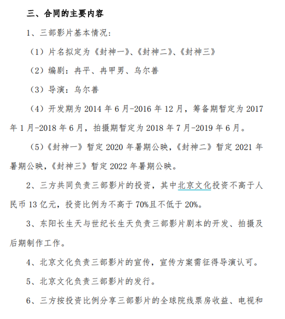 2021年,为缓解资金压力,北京文化曾将《封神三部曲》影片各25%的份额,转让给西藏慧普华企业管理有限公司。转让价格均为2亿元,累计合同金额6亿元。