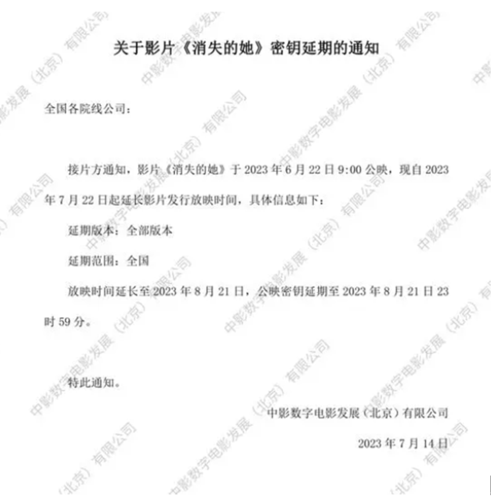 7月14日,悬疑犯罪电影《消失的她》宣布密钥延期,延长上映至8月21日。