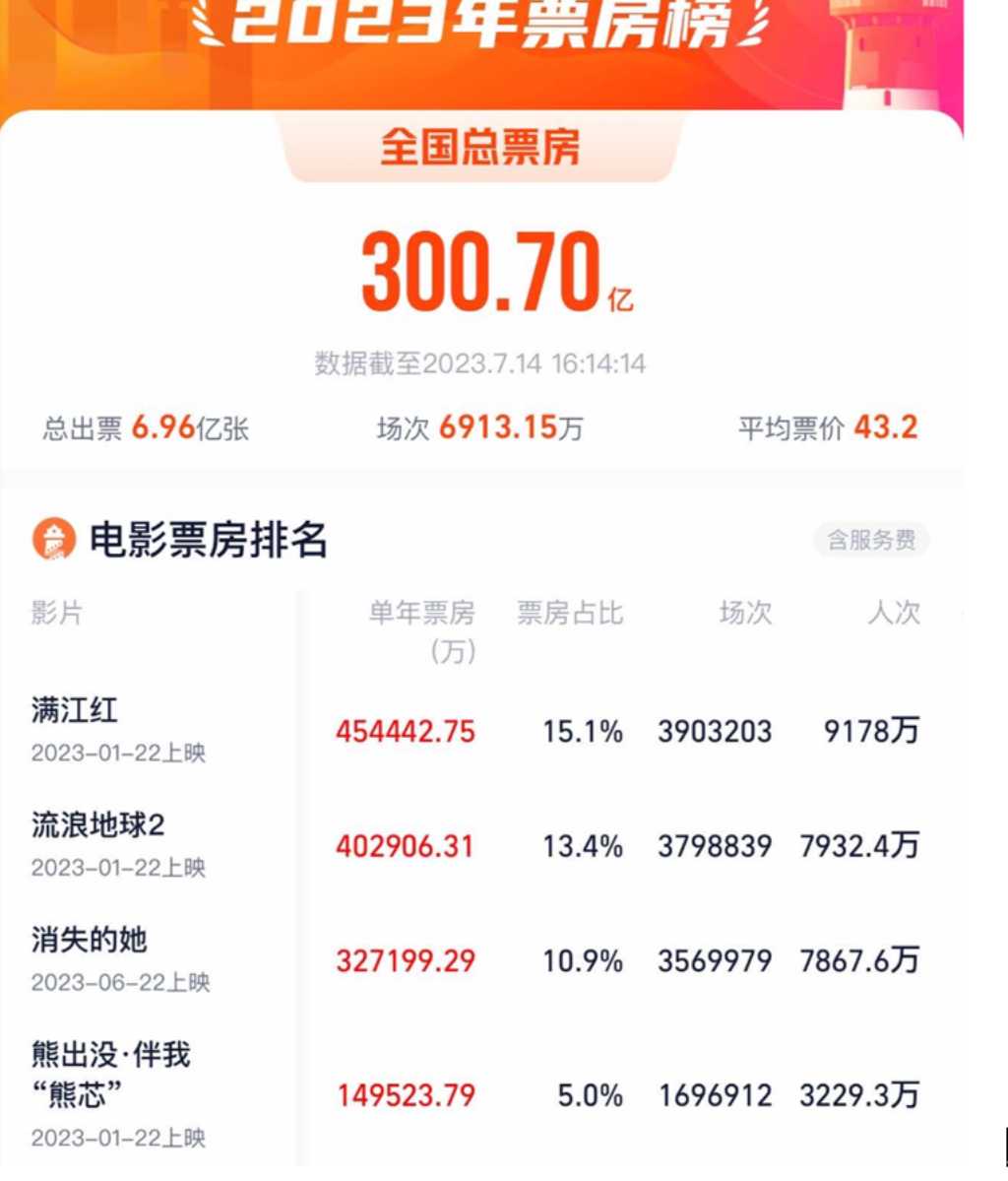 截至7月14日,2023年度大盘票房(含预售)突破300亿,追近2022年全年300.67亿总票房图据灯塔专业版
