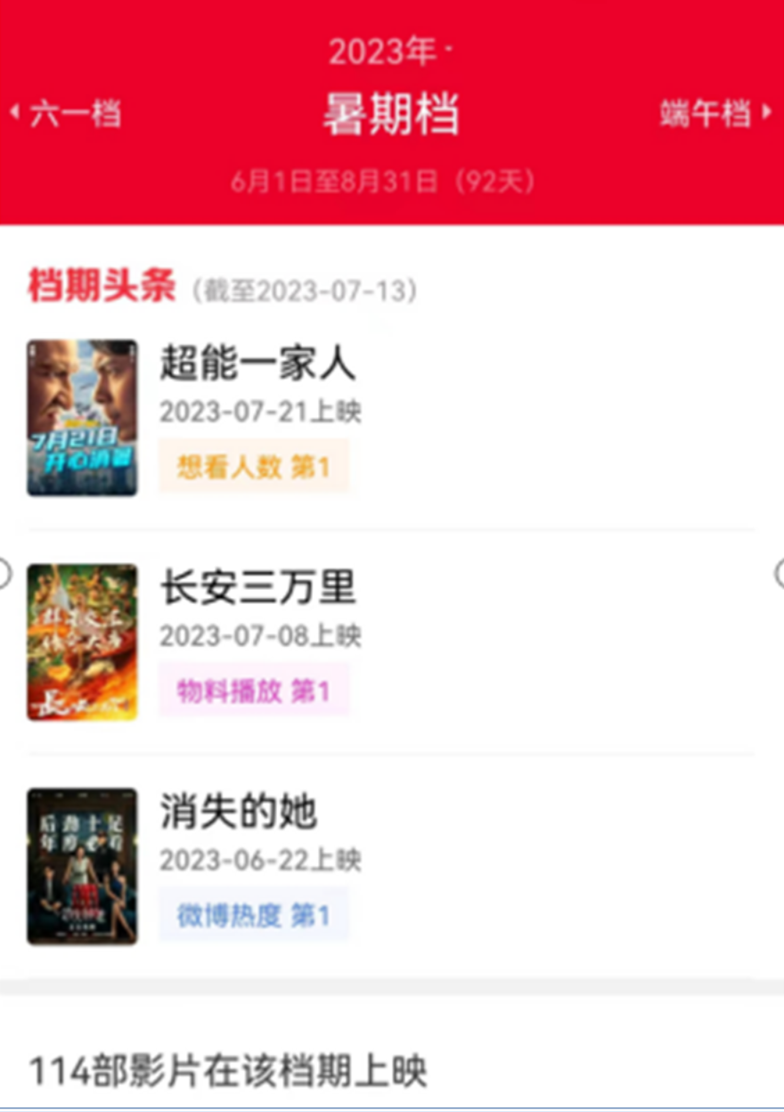 《消失的她》领衔开局,截止到7月13日,该片票房已超过32亿元。动画电影《长安三万里》口碑炸裂,上映一周豆瓣评分上涨至8.2。接下来,还将有《封神第一部》《碟中谍7》《超能一家人》陆续在7月上映。据猫眼专业版数据,目前共有114部电影选择在今年暑期档上映,券商分析今年暑期档中国电影市场将重回百亿票房。据灯塔专业版实时数据,截至7月14日,2023年暑期档(6月1日-8月31日)总票房(含预售)已突破80亿。