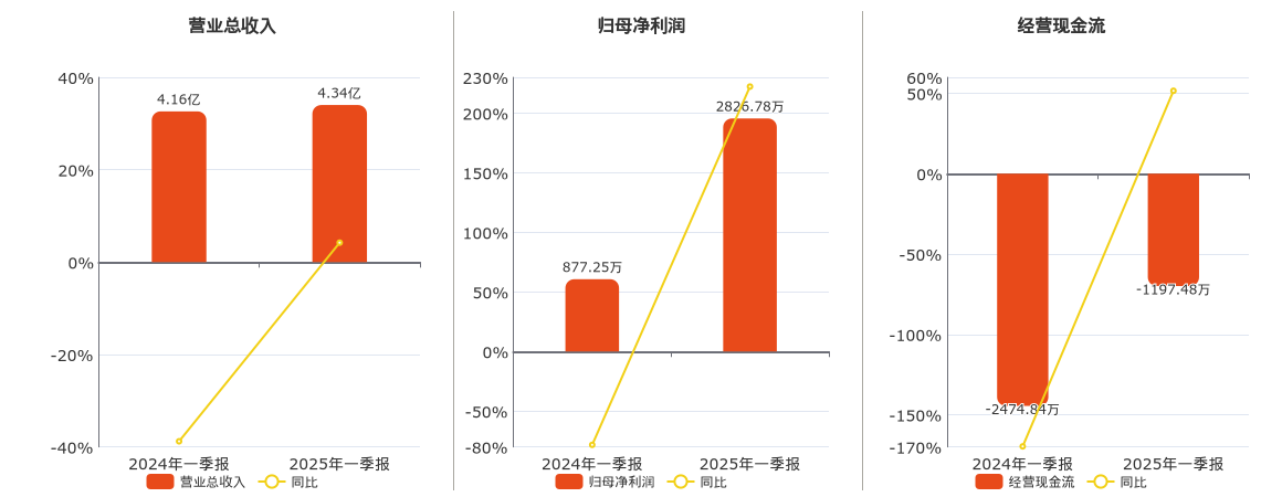 公司营业总收入为4.34亿元,较去年同报告期营业总收入增加1753.60万元,同比较去年同期上涨4.21%。归母净利润为2826.78万元,较去年同报告期归母净利润增加1949.53万元,同比较去年同期上涨222.23%。经营活动现金净流入为-1197.48万元,较去年同报告期经营活动现金净流入增加1277.36万元。