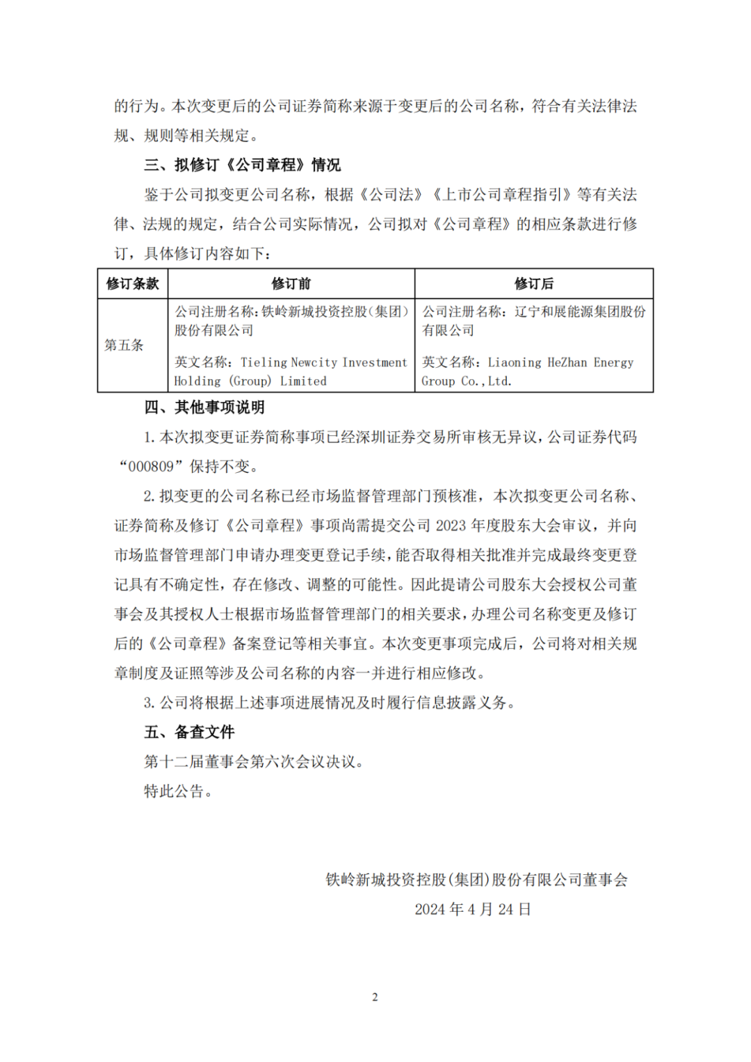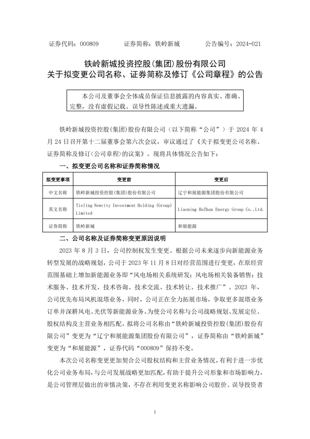 《关于拟变更公司名称、证券简称及修订公司章程的公告》显示,铁岭新城拟将公司名称由“铁岭新城投资控股(集团)股份有限公司”变更为“辽宁和展能源集团股份有限公司”,证券简称由“铁岭新城”变更为“和展能源”,证券代码“000809”保持不变。