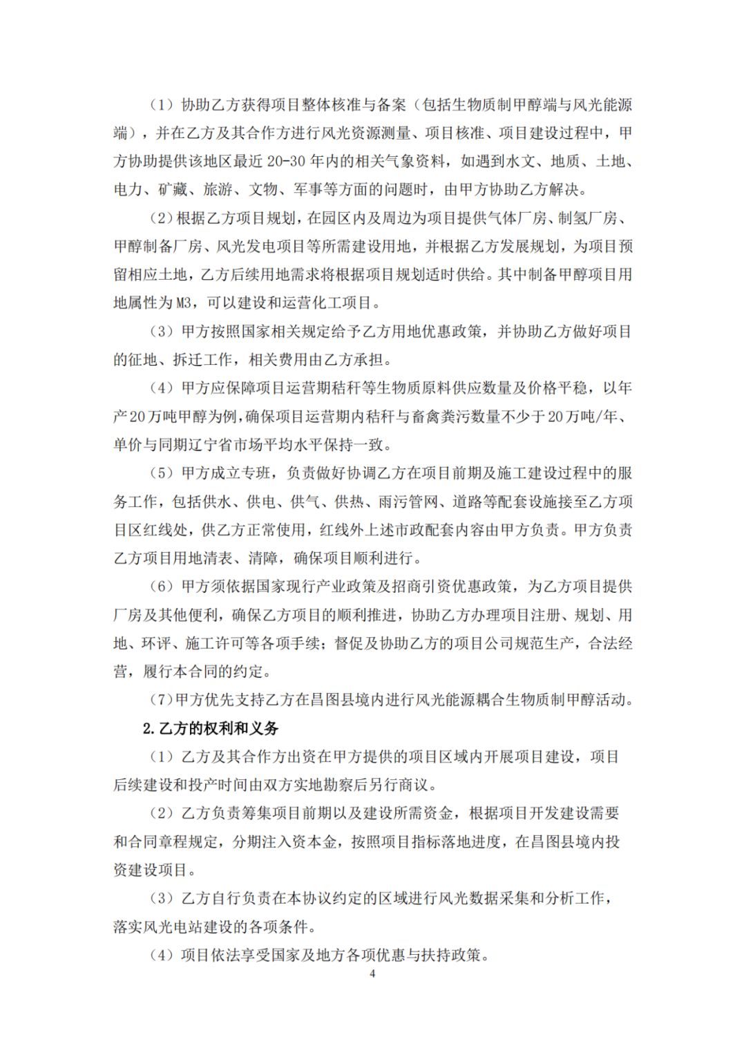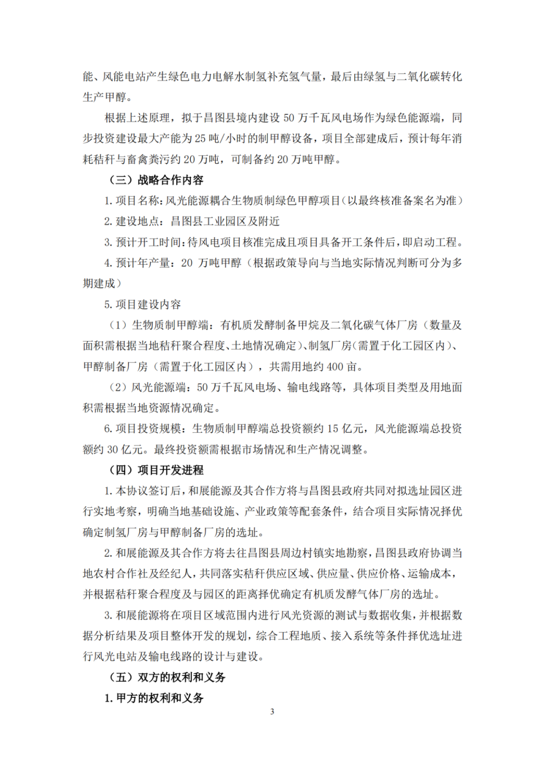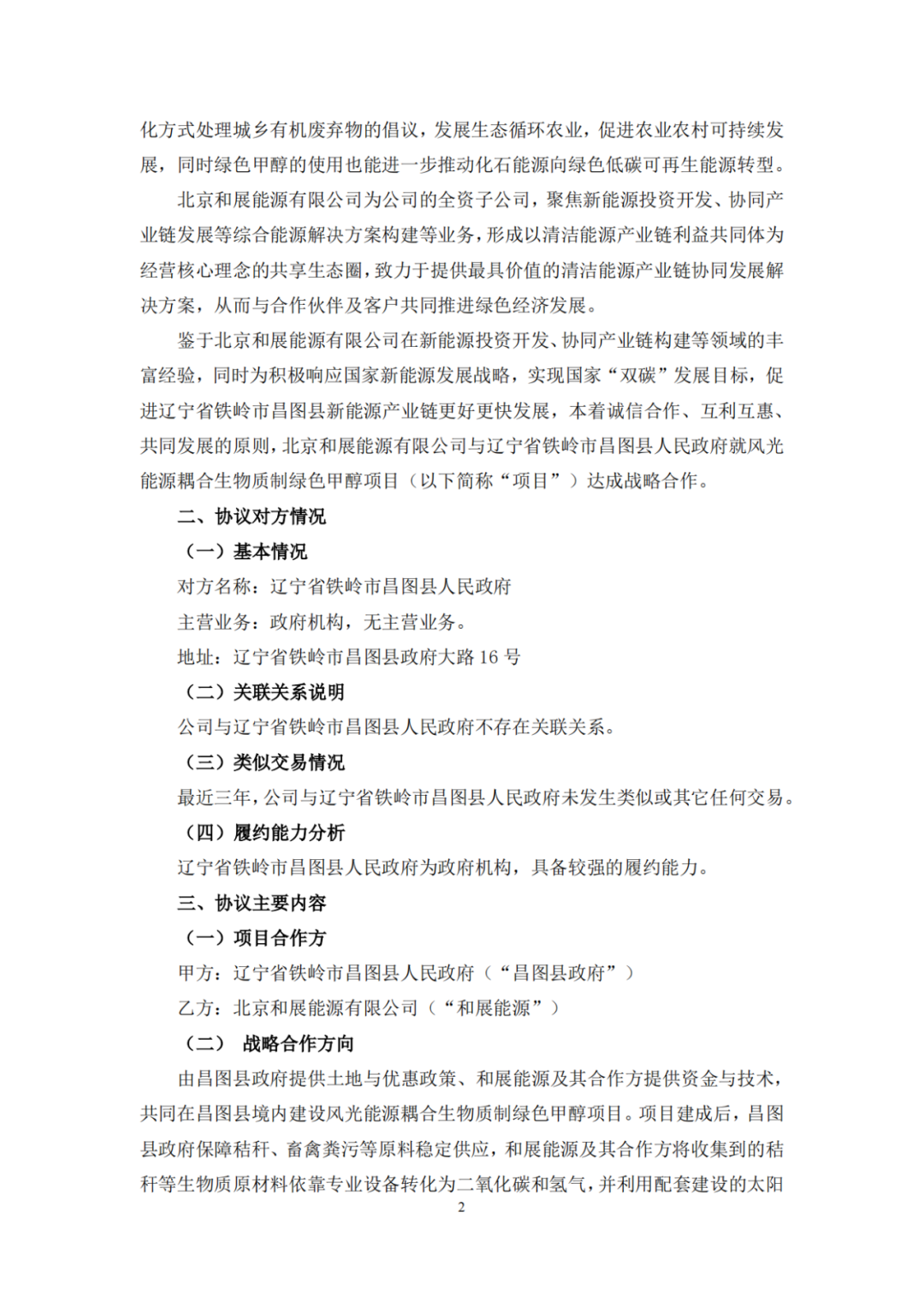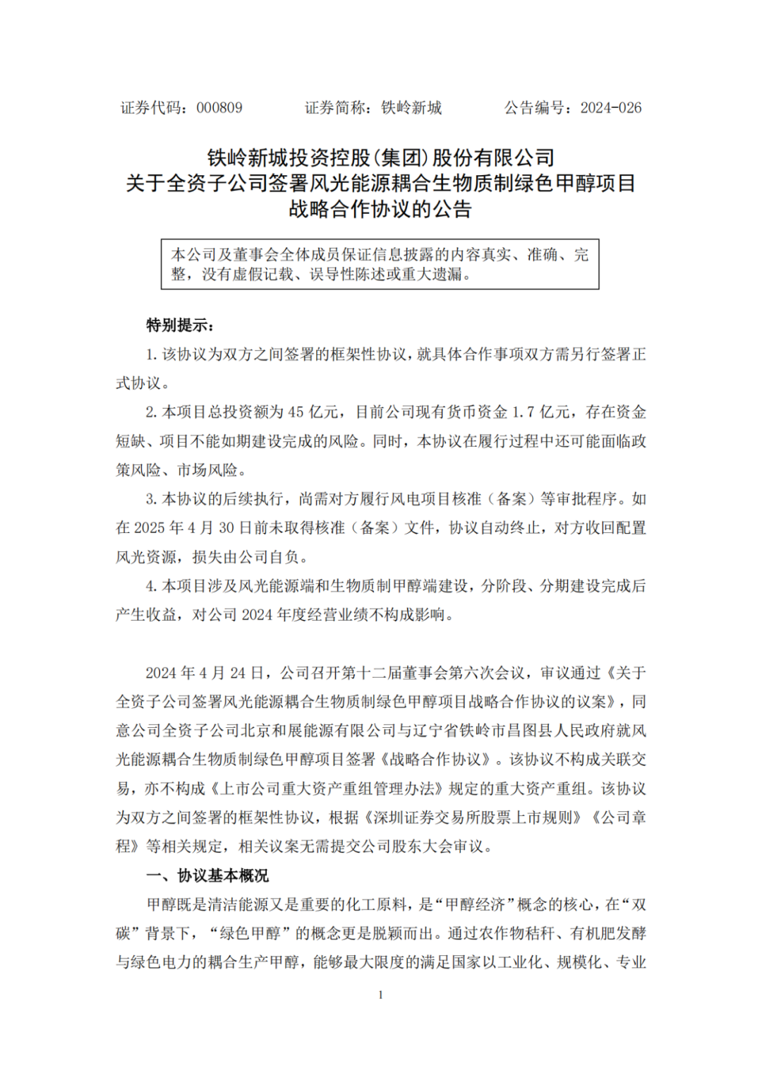 《2024-026关于全资子公司签署风光能源耦合生物质制绿色甲醇项目战略合作协议的公告》显示,铁岭新城全资子公司北京和展能源有限公司与辽宁省铁岭市昌图县人民政府就风光能源耦合生物质制绿色甲醇项目签署《战略合作协议》。项目拟于昌图县境内建设50万千瓦风电场作为绿色能源端,同步投资建设最大产能为25吨/小时的制甲醇设备,项目全部建成后,预计每年消耗秸秆与畜禽粪污约20万吨,可制备约20万吨甲醇。项目总投资额为45亿元。