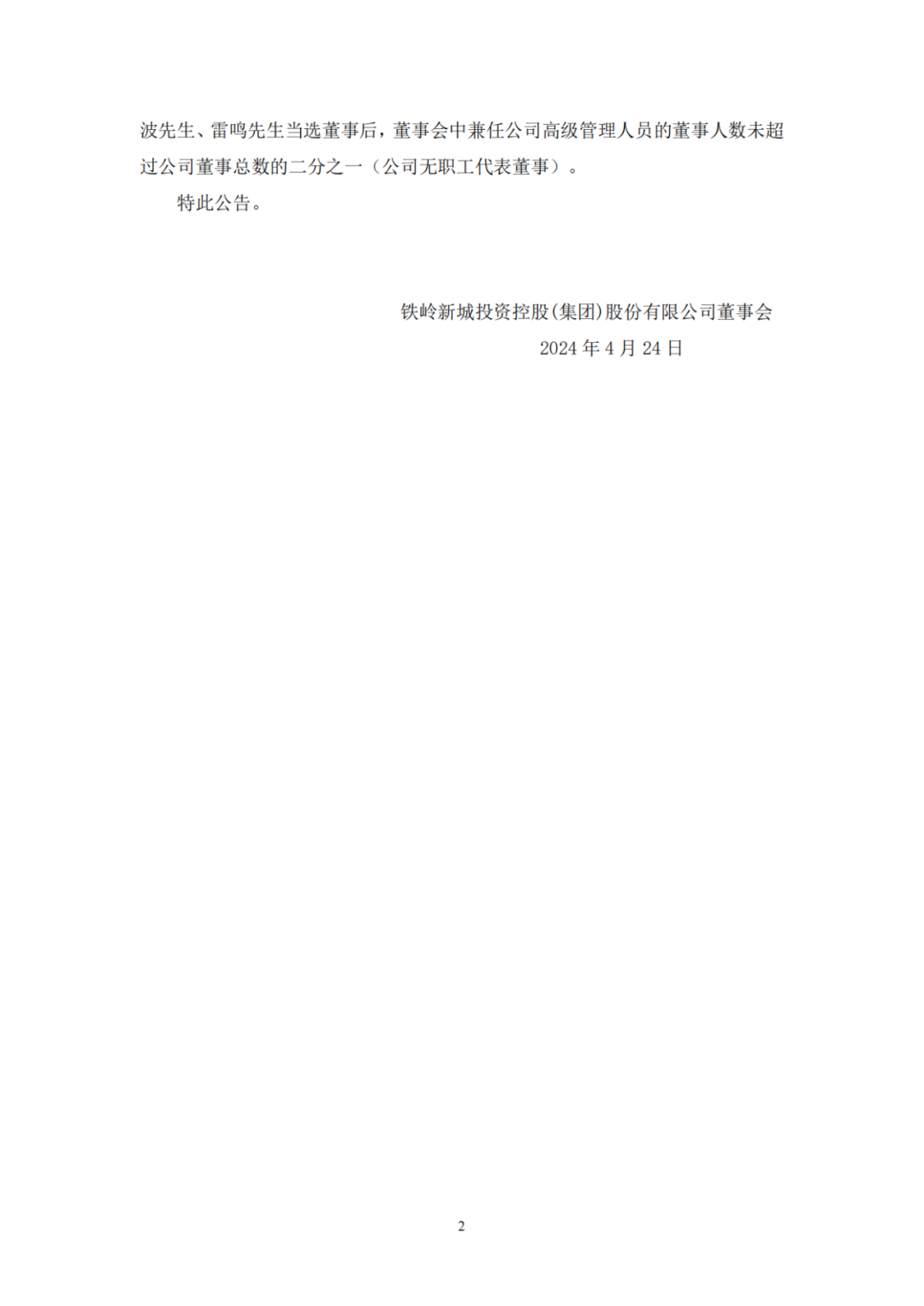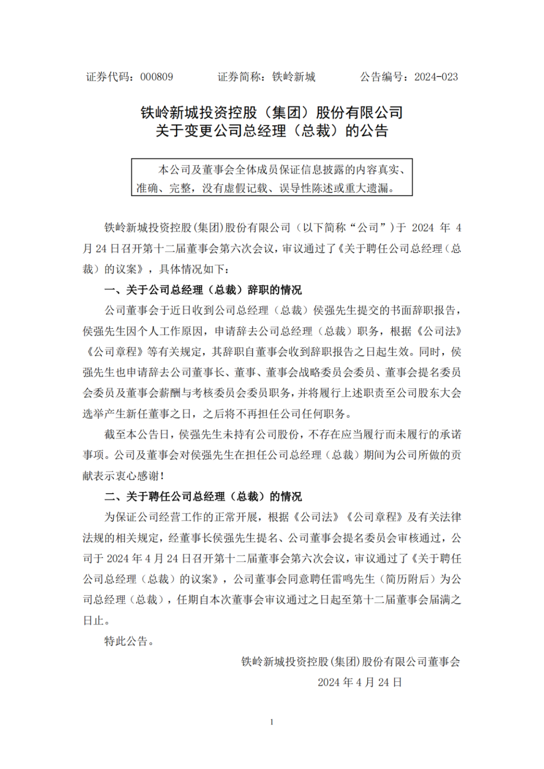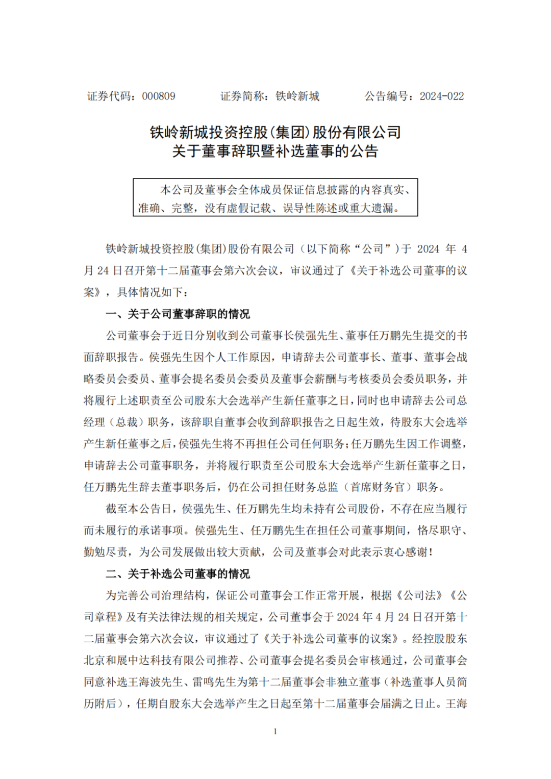 近日铁岭新城同步发布的《关于董事辞职暨补选董事的公告》显示,公司董事会于近日分别收到公司董事长侯强、董事任万鹏提交的书面辞职报告。侯强因个人工作原因,申请辞去公司董事长、董事、董事会战略委员会委员、董事会提名委员会委员及董事会薪酬与考核委员会委员职务,并将履行上述职责至公司股东大会选举产生新任董事之日,同时也申请辞去公司总经理(总裁)职务,该辞职自董事会收到辞职报告之日起生效,待股东大会选举产生新任董事之后,侯强先生将不再担任公司任何职务;任万鹏先生因工作调整,申请辞去公司董事职务,并将履行职责至公司股东大会选举产生新任董事之日,任万鹏先生辞去董事职务后,仍在公司担任财务总监(首席财务官)职务。