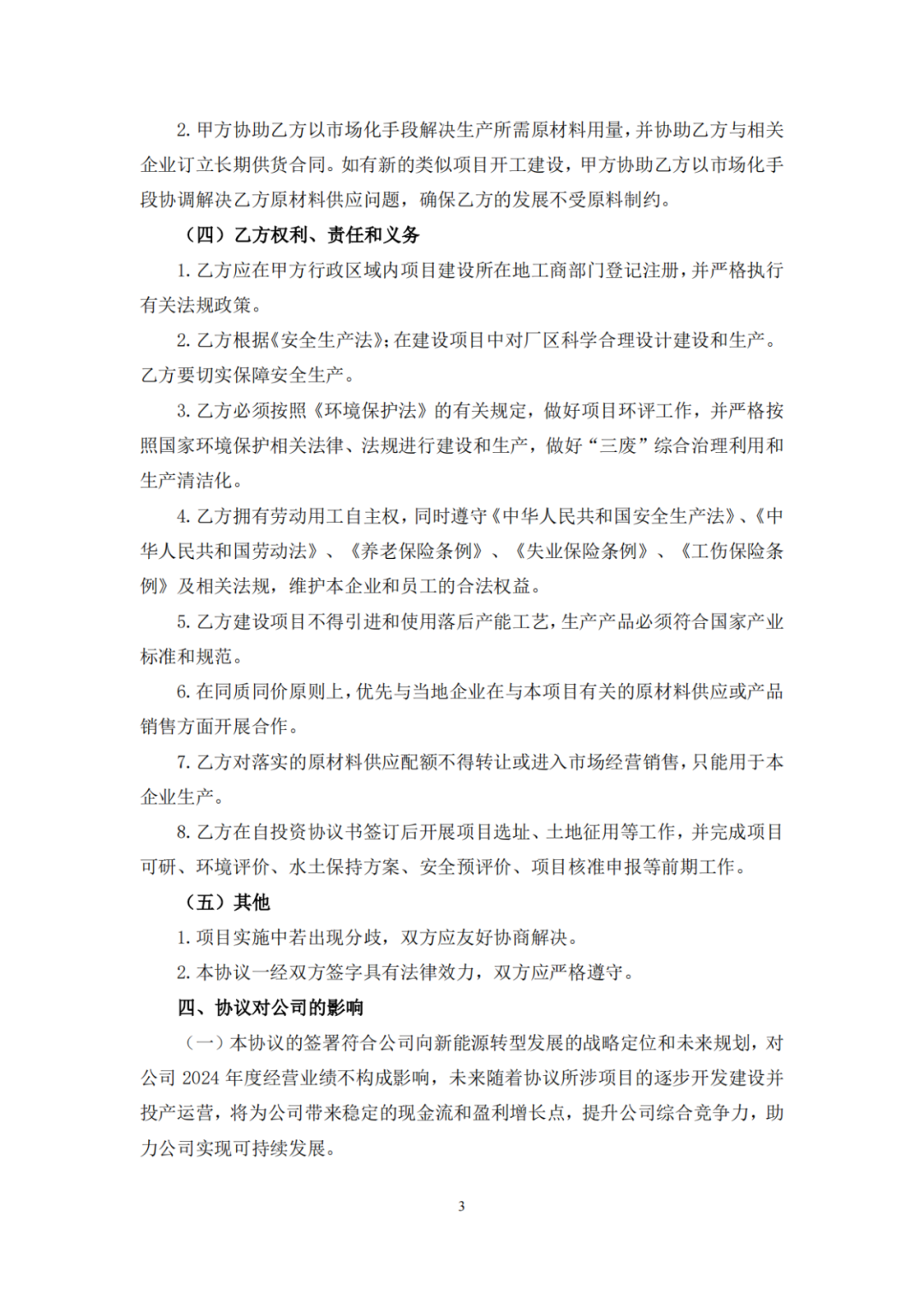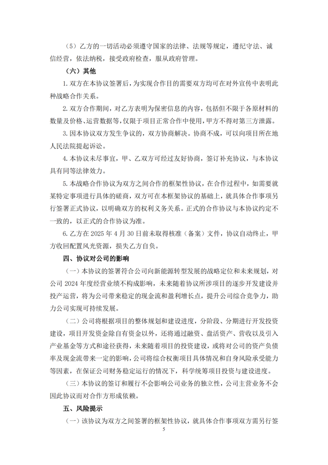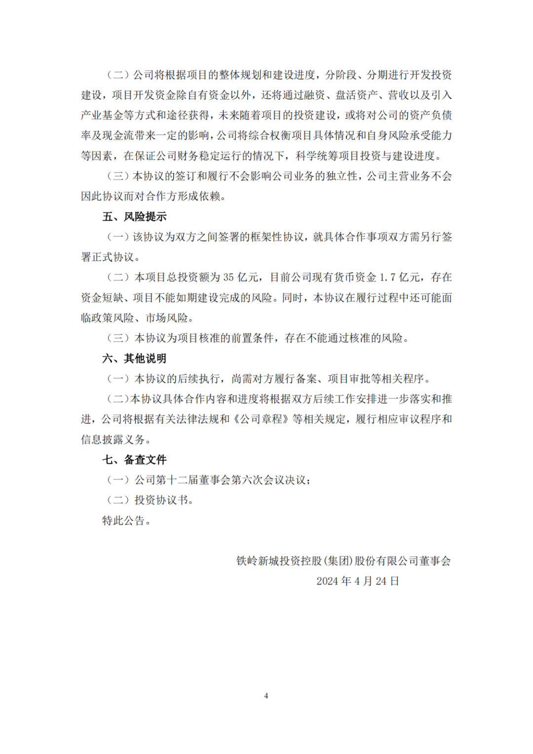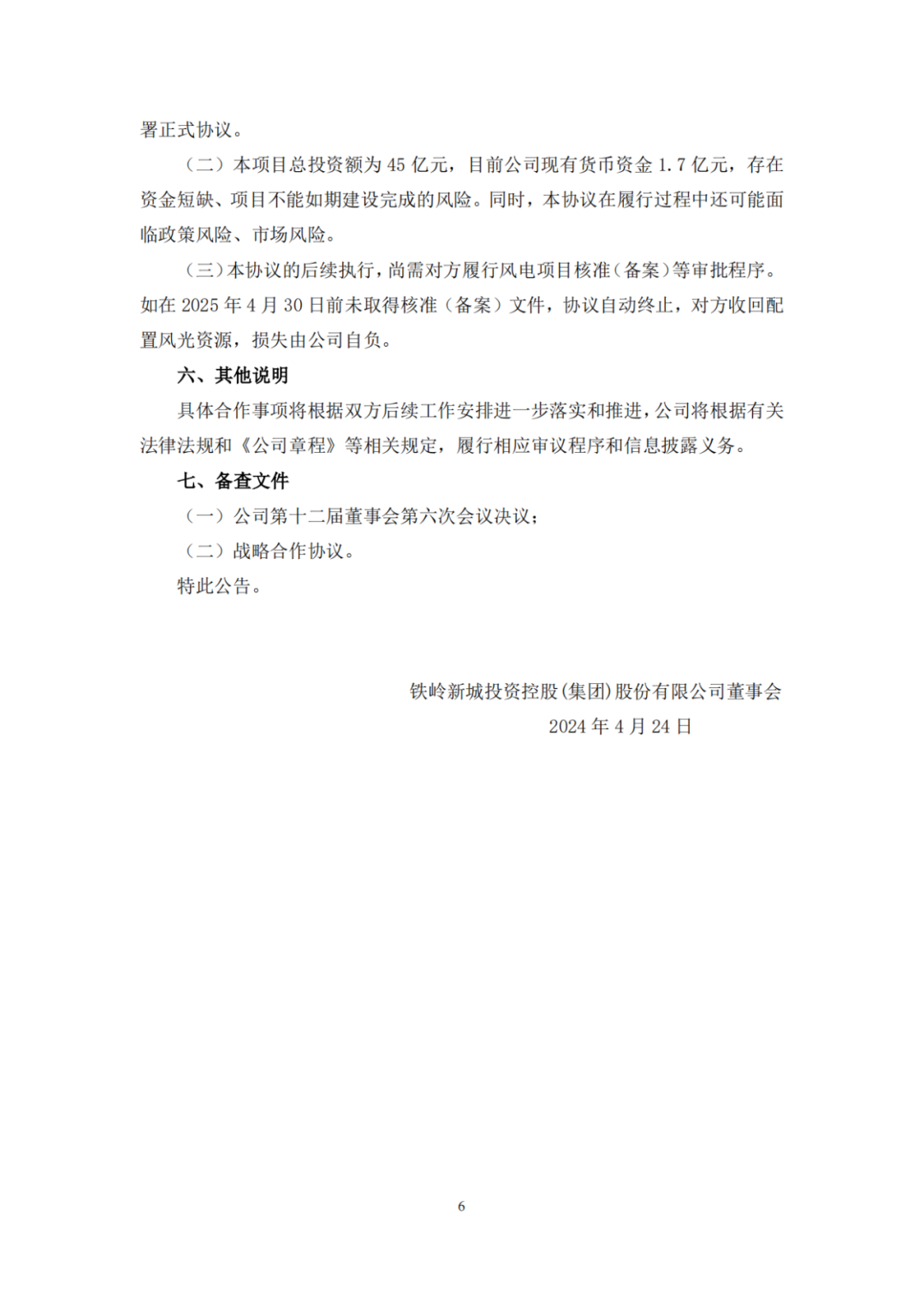 根据今年4月26日,铁岭新城发布的《2024-025关于签署100万千瓦新能源发电项目投资协议书的公告》,铁岭新城与大柴旦行委经济发展改革和统计局就海西州大柴旦行委100万千瓦新能源发电项目签署《投资协议书》。项目为在大柴旦行委地区为大数据中心配套建设100万千瓦新能源发电项目(含风电、光伏等),年生产绿色电力约20亿度,预计总投资约35亿元。