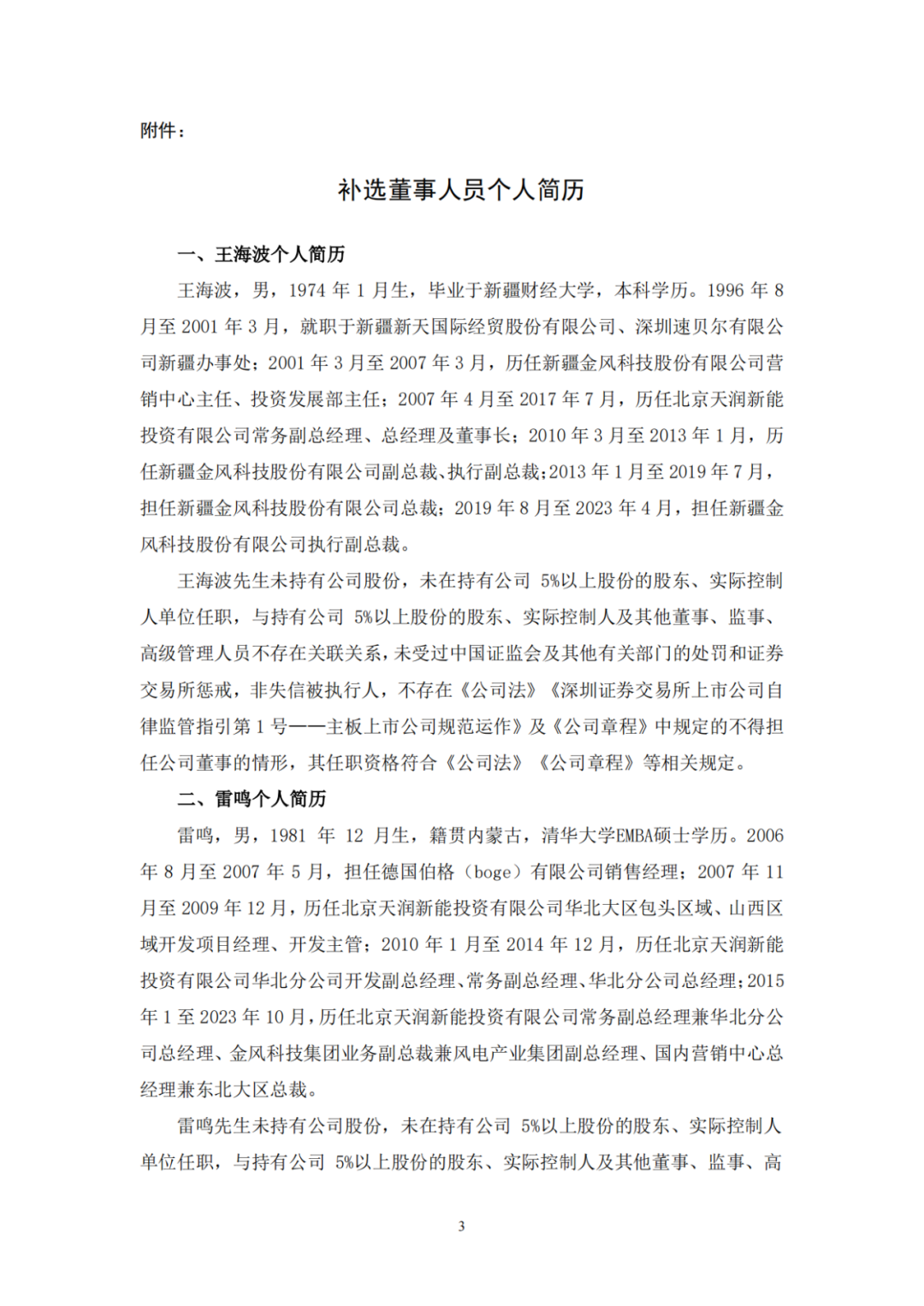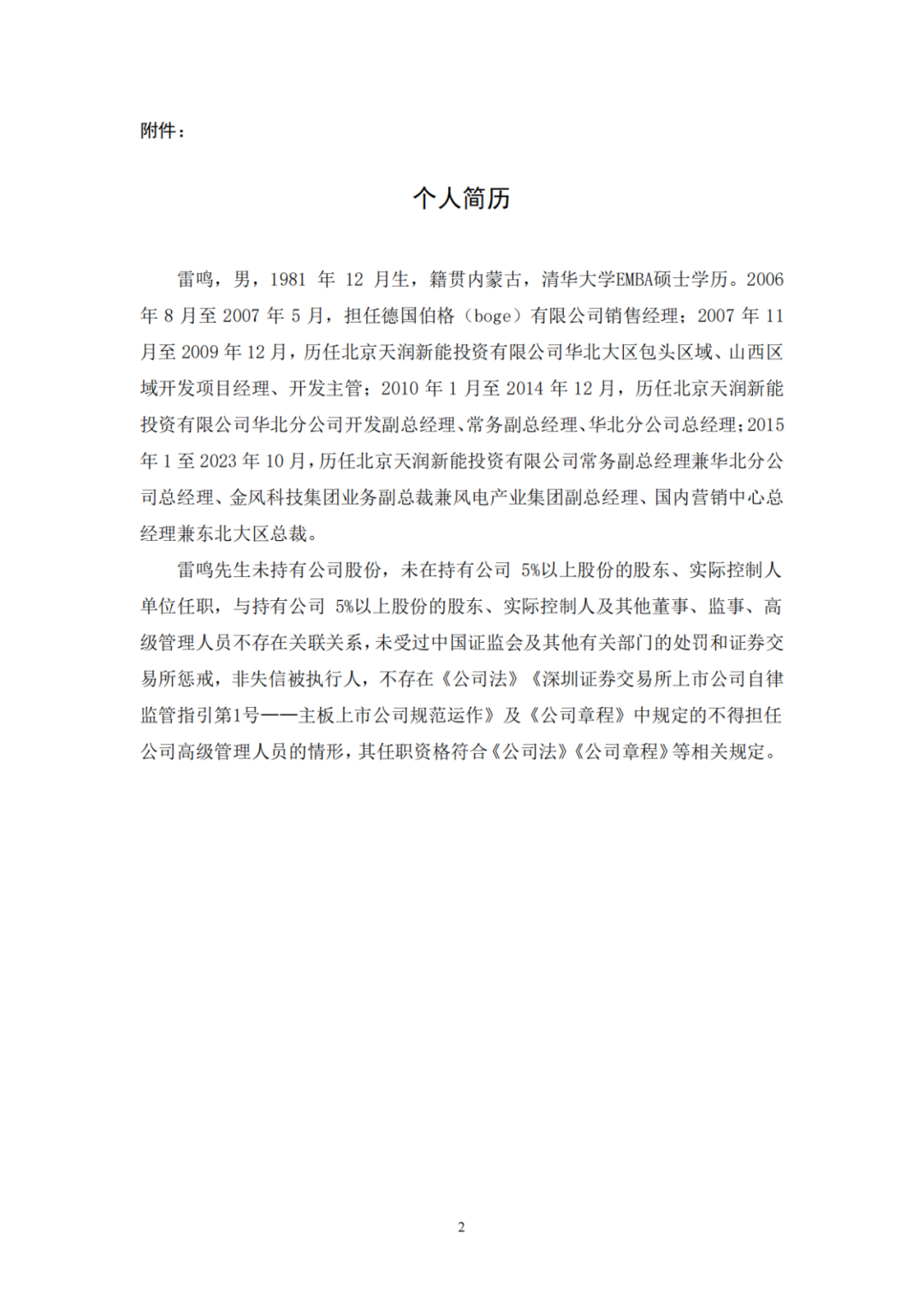 根据两人简历,王海波、雷鸣均出身金风科技。王海波曾多年担任金风科技副总裁、总裁、执行副总裁职务。雷鸣,也历任北京天润新能投资有限公司常务副总经理兼华北分公司总经理、金风科技集团业务副总裁兼风电产业集团副总经理、国内营销中心总经理兼东北大区总裁等。