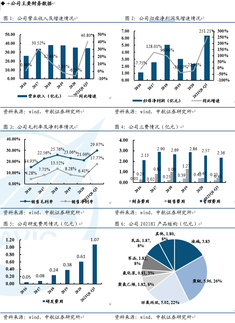 公司2021Q1-Q3综合毛利率29.27%(+10.11pcts),净利率17.77%(+10.67pcts),ROE 19.02%(+12.62pcts),我们认为,公司经营指标大幅提升一方面主要是公司化工板块在规模快速扩张的情况下,主要化工品(聚醚、环氧丙烷等)处于景气周期,产品价格上涨,盈利能力持续提升,带动公司化工板块毛利率大幅提升;另一方面是公司军工电子板块保持高景气度,2021H1公司军品毛利率提升7.54%。