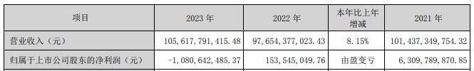 太钢不锈发布年度业绩报告称,2023年营业收入1056.18亿元,同比增加8.15%;归属于上市公司股东的净利润亏损10.81亿元。