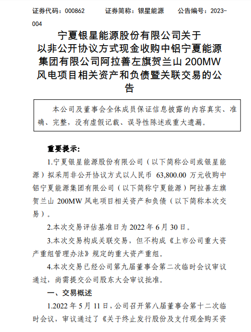 北极星风力发电网讯:银星能源日前发布公告称,公司拟采用非公开协议方式以63800万元收购中铝宁夏能源集团有限公司阿拉善左旗贺兰山200MW风电项目相关资产和负债。