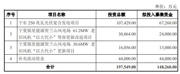 昨晚,银星能源发布向特定对象发行A股股票预案。银星能源本次向特定对象发行股票拟募集资金总额不超过148,260万元,扣除发行费用后的募集资金净额将用于宁东250兆瓦光伏复合发电项目、宁夏银星能源贺兰山风电场61.2MW老旧风机“以大代小”等容更新改造项目、宁夏银星能源贺兰山风电场30.6MW老旧风机“以大代小”更新项目、补充流动资金。