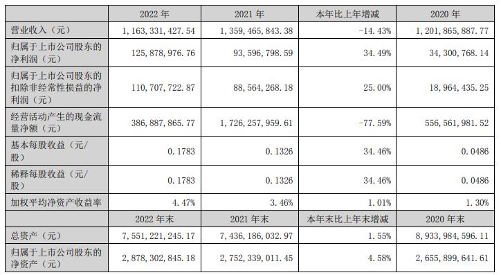 2022年,银星能源营业收入11.63亿元,同比减少14.43%;归属于上市公司股东的净利润1.26亿元,同比增长34.49%;归属于上市公司股东的扣除非经常性损益的净利润1.11亿元,同比增长25.00%;经营活动产生的现金流量净额3.87亿元,同比减少77.59%。