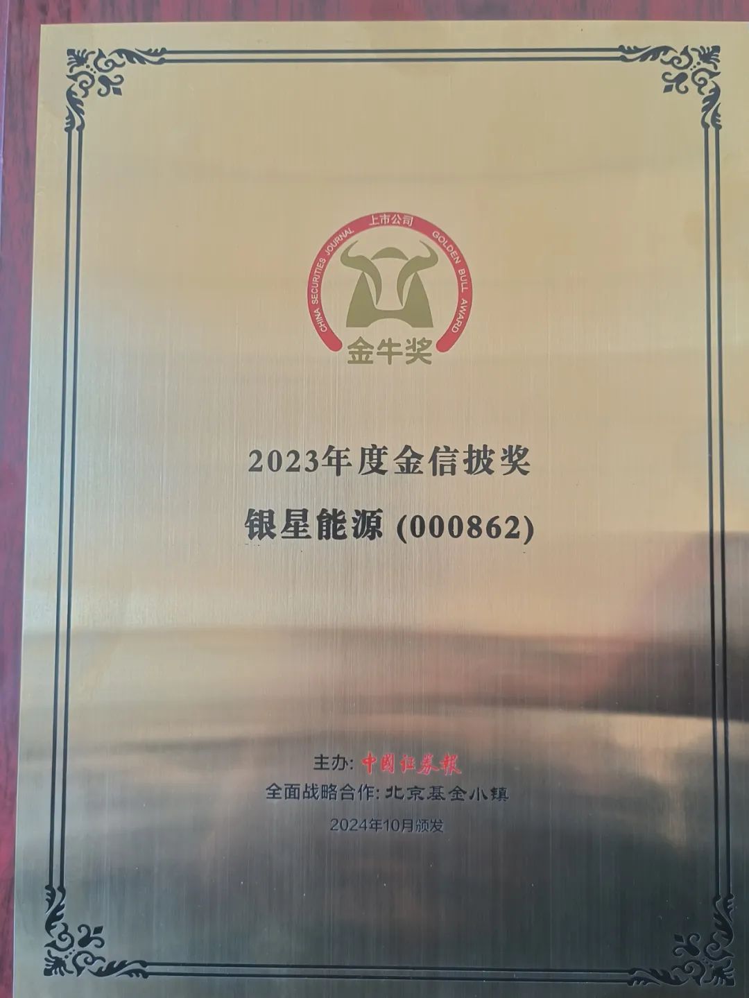8.2024年10月24日,由中国证券报与南通市人民政府主办、北京基金小镇全面战略合作的2024上市公司高质量发展论坛暨第二十六届上市公司金牛奖颁奖典礼在江苏南通举行。银星能源凭借在信息披露、投资者关系管理等方面的优异表现,荣获“金信披奖”。该项荣誉的获得,充分体现了资本市场和广大投资者对银星能源在信息披露、投资者关系管理等工作的高度认可。