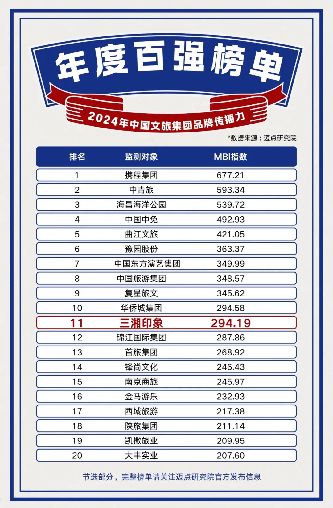 近日,迈点研究院发布“2024年中国文旅集团品牌传播力100强榜单”,三湘印象凭借卓越的品牌传播力脱颖而出,位列全榜第11名。