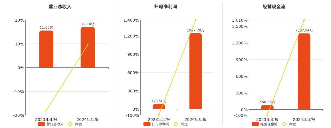 公司营业总收入为12.10亿元。归母净利润为1927.79万元。经营活动现金净流入为7687.94万元。