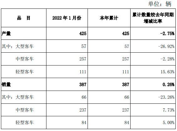 2月10日,安凯客车(SZ000868)公告,2022年1月产量为425辆,同比减少2.75%;2022年1月销量为387辆,同比增加0.26%。