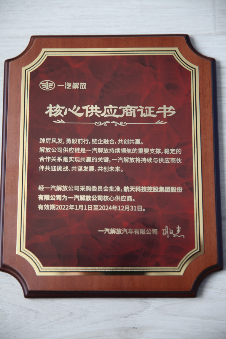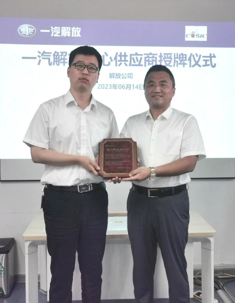 近日,公司总经理助理、航天科技哈尔滨公司党委副书记、总经理王大钊从一汽解放公司采购部部长董亚洲手里,接过沉甸甸的“核心供应商”奖牌。这既是一份荣誉、一个肯定、一种激励,更是双方“共迎挑战、共谋发展、共创未来”的誓言和期许。