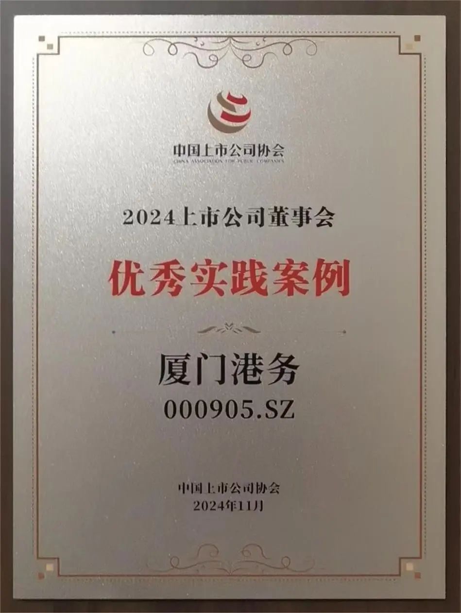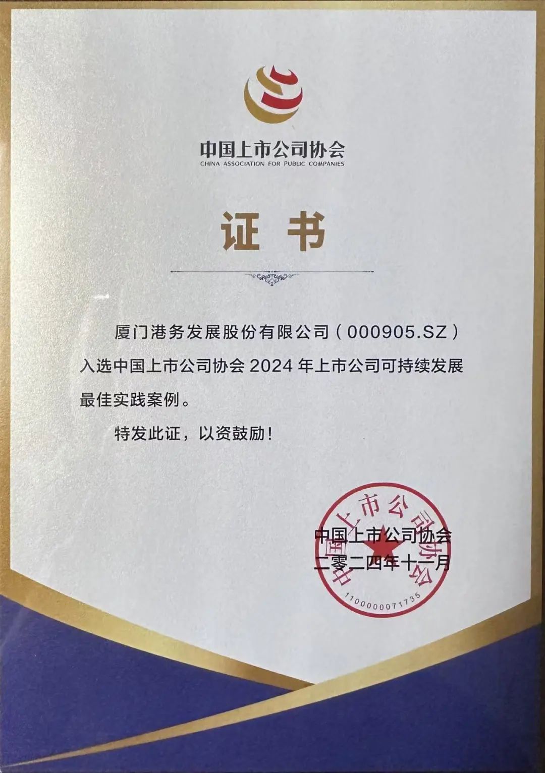 11月22日,中国上市公司协会第三届理事会第五次会议、中国上市公司协会2024上市公司可持续发展大会先后在北京召开。厦门港务发展股份有限公司(000905.SZ)凭借其在董事会建设、ESG实践等方面的工作特色成功入选“2024上市公司董事会优秀实践案例”、“2024年上市公司可持续发展最佳实践案例”。