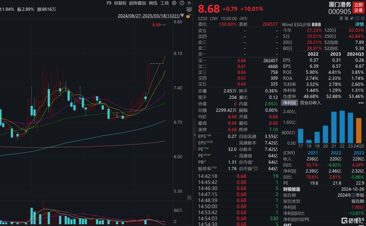 停牌一周,3月18日,厦门港务(000905.SZ)复牌即一字涨停板,报8.68元/股,总市值64.39亿元,成交额2299万元。