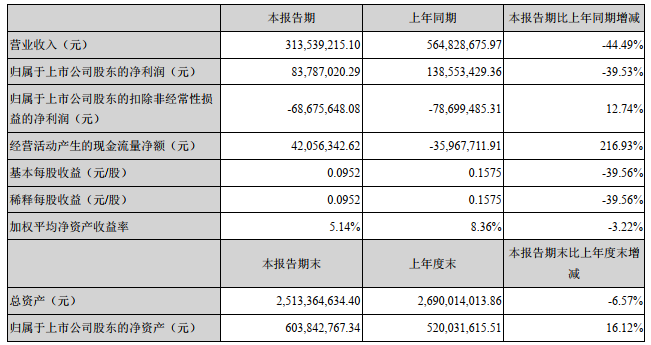 今年上半年,景峰医药实现营业收入3.14亿元,同比下降44.49%;归属于上市公司股东的净利润8378.70万元,同比下降39.53%;归属于上市公司股东的扣除非经常性损益的净利润-6867.56万元,同比增长12.74%;经营活动产生的现金流量净额4205.63万元,同比增长216.93%。