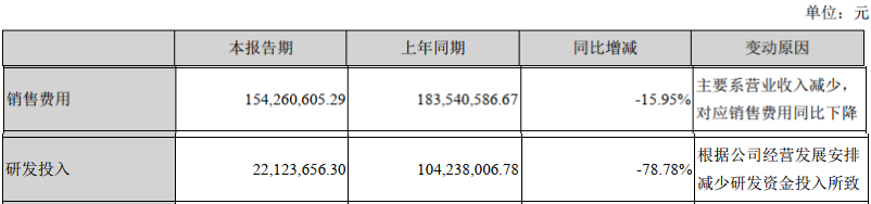 今年上半年,景峰医药的销售费用为1.54亿元,同比减少15.95%,变动原因主要系营业收入减少,对应销售费用同比下降;研发投入为2212.37万元,同比减少78.78%,变动原因为根据公司经营发展安排减少研发资金投入所致。