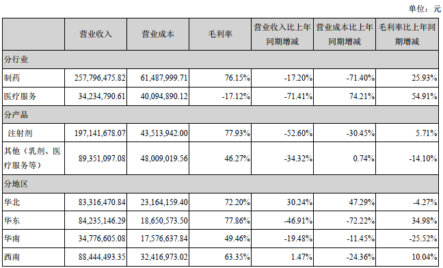 分地区来看,今年上半年,景峰医药华北毛利率为72.20%,比上年同期下降4.27个百分点;华东毛利率为77.86%,比上年同期上升34.98个百分点;华南毛利率为49.46%,比上年同期下降25.52个百分点;西南毛利率为63.35%,比上年同期上升10.04个百分点。