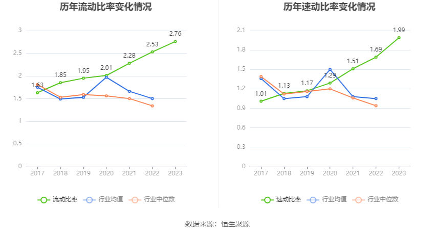 2023年,公司流动比率为2.76,速动比率为1.99。