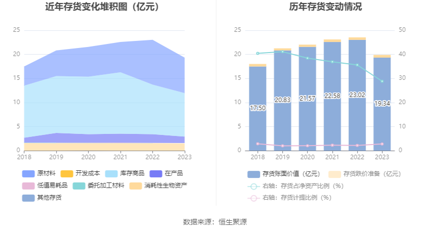 从存货变动来看,截至2023年年末,公司存货账面价值为19.34亿元,占净资产的28.85%,较上年末减少3.67亿元。其中,存货跌价准备为5590.6万元,计提比例为2.81%。
