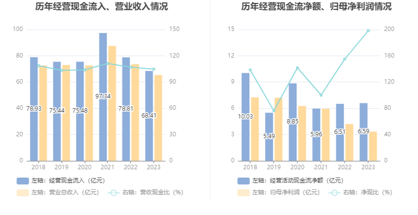 2023年,公司营业收入现金比为104.74%,净现比为198.19%。