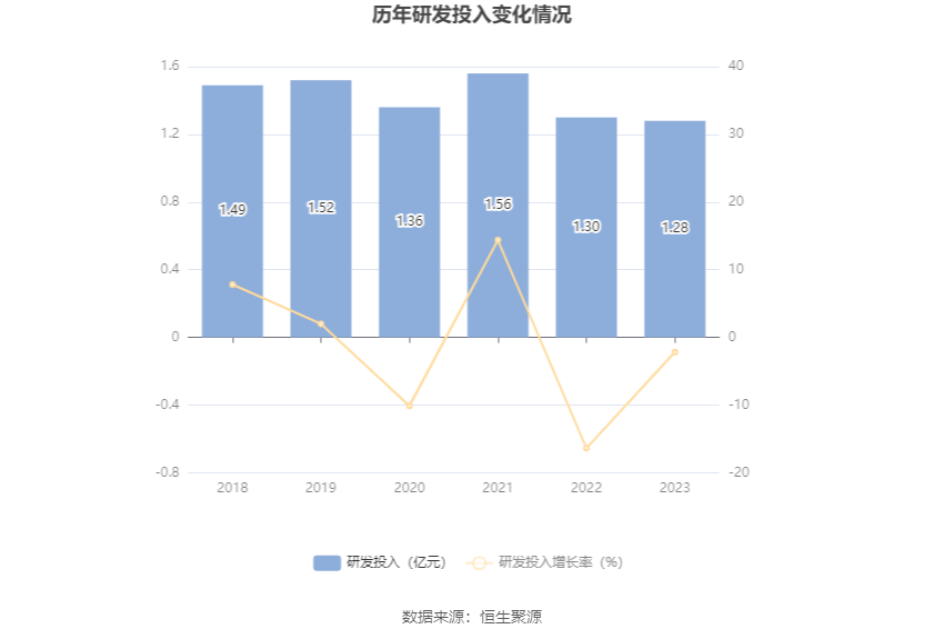 2023年全年,公司研发投入金额为1.28亿元,同比下降2.16%;研发投入占营业收入比例为1.95%,相比上年同期上升0.18个百分点。此外,公司全年研发投入资本化率为0。