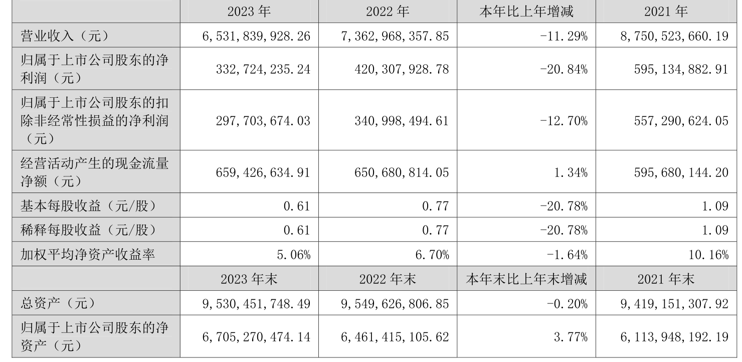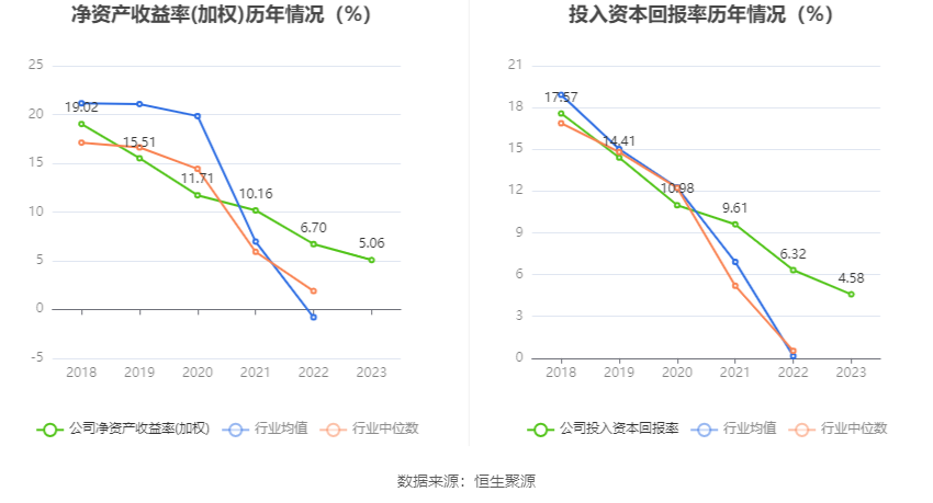 数据显示,2023年公司加权平均净资产收益率为5.06%,较上年同期下降1.64个百分点;公司2023年投入资本回报率为4.58%,较上年同期下降1.74个百分点。
