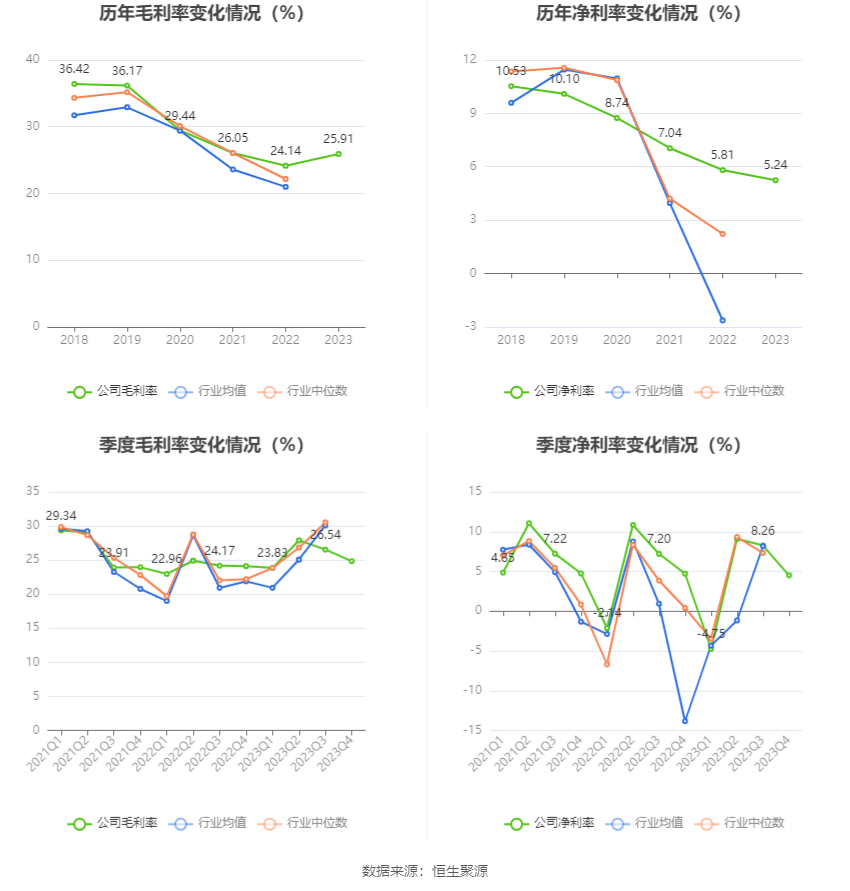 2023年,公司毛利率为25.91%,同比上升1.77个百分点;净利率为5.24%,较上年同期下降0.57个百分点。从单季度指标来看,2023年第四季度公司毛利率为24.83%,同比上升0.72个百分点,环比下降1.71个百分点;净利率为4.51%,较上年同期下降0.21个百分点,较上一季度下降3.75个百分点。