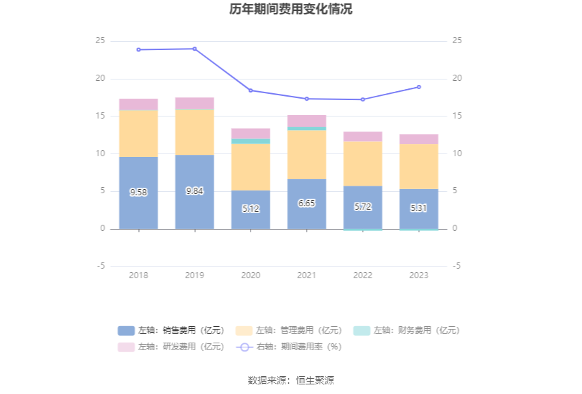 2023年,公司期间费用为12.34亿元,较上年同期减少3478.98万元;但期间费用率为18.89%,较上年同期上升1.66个百分点。其中,销售费用同比下降7.09%,管理费用同比增长1.27%,研发费用同比下降2.16%,财务费用由去年同期的-2534.62万元变为-2426.45万元。