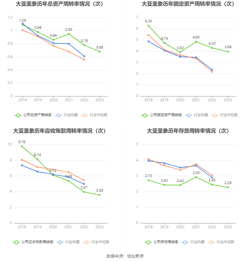 营运能力方面,2023年,公司公司总资产周转率为0.68次,上年同期为0.78次(2022年行业平均值为0.61次,公司位居同行业4/10);固定资产周转率为3.98次,上年同期为4.30次(2022年行业平均值为2.35次,公司位居同行业2/10);公司应收账款周转率、存货周转率分别为3.58次、2.28次。