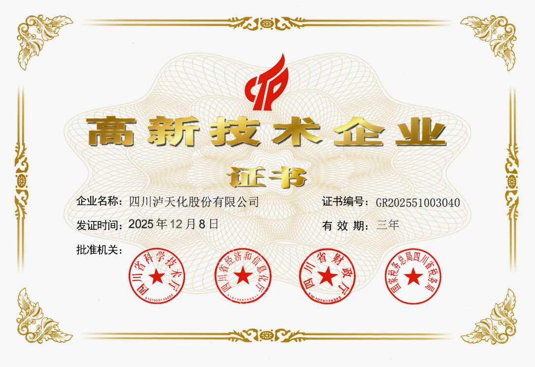 日前,四川泸天化股份有限公司再次通过国家高新技术企业认定,荣获由四川省科学技术厅、经济和信息化厅、财政厅、国家税务总局四川省税务局联合颁发的《高新技术企业证书》(证书编号GR202551003040),有效期三年。这是自2013年首次获批以来,公司第五次通过该项权威认证。